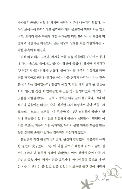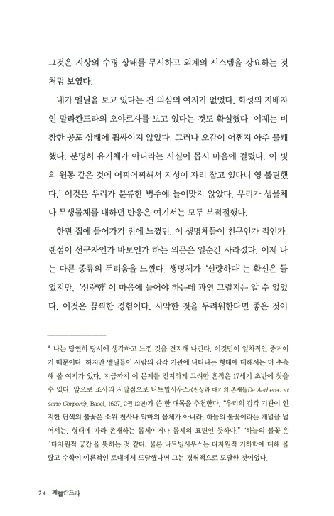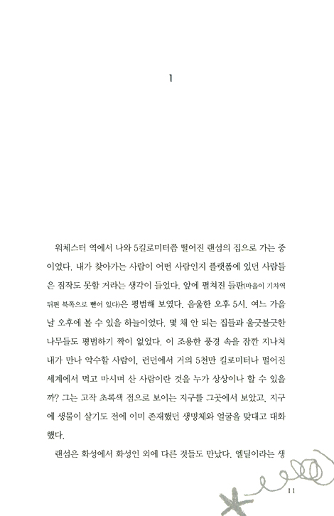 3킬로미터쯤 떨어진 곳에 누르께한 초록색 물 위로 검고 둥그런 작은 물체가 있었다. 지구의 바다였다면 첫눈에 부표로 여겼을 터였다. (중략) 실제 이름은‘말라칸드라’지만 인간들은 화성이라고 부르는 세계에 랜섬이 다녀왔다는 이야기는 여러분도 이미 들어서 안다. 하지만 그를 그곳에 데려간 것은 엘딜들이 아니라 인간들이었다. 그들은 그를 강제로 유리와 쇠로 만든 우주선에 태워 납치했는데, 그들은 말라칸드라의 권력자들이 인간을 제물로 요구한다고 생각한 것이다. 모든 것은 오해였다. 태초부터 화성을 지배한 위대한 오야르사(랜섬의 전원주택에서 내 눈으로 봤던)는 그를 해하지 않았고 그럴 의도도 없었다. 하지만 납치를 주도한 웨스턴 교수는 그를 크게 해치려 했다. 그는 현재 지구에서 유행하는 행성 간 협회나 로켓공학클럽의‘과학화’라는 모호한 작업 아이디어에 사로잡힌 사람이었다. (중략) 대단한 물리학자인 그는 우주선을 만들 수 있는 원동력을 발견했다. 이제 페렐란드라의 순결한 물에 떠 있는 저 작고 검은 물체는 시시각각 더 우주선처럼 보이고 있었다. ‘그래, 내가 여기 온 이유가 이거로군. 웨스턴은 말라칸드라에서 실패하고 이제 여기 온 거야. 뭔가 조치를 취해야 해.’
