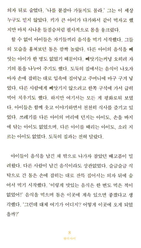 낡고 낡은 누더기가 나의 옷이었고, 먹다 남은 쓰레기가 나의 양식이었으며, 눈만 뜨면 때리고 욕하는 자들이 나의 형제였다. 사람들은 우리를 도둑의 자식이라 불렀다.