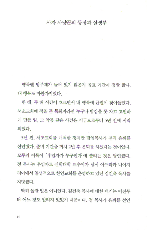 더욱이 그 금기와 성역이 신의 이름으로 포장되면 상상을 초월할 정도의 위선과 거짓이 난무한다. 나는 이 책을 읽는 독자가 단 한순간이라도 도대체 인간에게 종교란 무엇인지, 그중에서도 하나님을 믿고 교회를 다닌다는 것이 무슨 의미인지 진지하게 생각하길 바란다. 그럼 이 글을 쓴 내 목표는 달성되는 셈이다. _〈작가의 말〉중에서