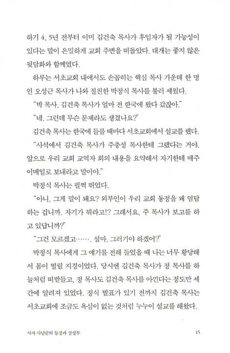 로이드 존스가 그를 영성의 세계로 이끌었다면, 문학의 세계로 안내한 건 러시아의 작가 알렉산드르 솔제니친이었다. 「이반 데니소비치의 하루」를 읽고 주체할 수 없는 전율을 경험한 후, 솔제니친의 모든 저작들을 끌어안고 많은 밤을 지새웠다. 감동은 자연스럽게 창작으로 이어졌다. 밤은 여전히 고독하고 치열했으며, 절망과 기쁨을 동시에 안겨주었다. 그 고뇌와 열정의 연장선에서, 오늘날 생각과 상식이 실종된 채 방황하는 한국 기독교에 작지만 의미 있는 질문을 던지고자 첫 장편소설 『서초교회 잔혹사』를 탈고하여 오늘 선보인다.