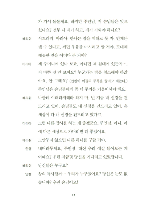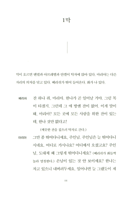 베리쉬: 샴고로드의 유대인 여관 주인인 나 베리쉬는 그를 적개심, 학대, 그리고 무관심의 죄로 고발하는 바이오. 그는 그의 백성을 싫어하든지 그들에게 관심이 없든지 둘 중 하나요! 그런데 말이오, 그는 왜 우리를 선택했을까? 왜 한 번쯤 다른 사람을 선택하지 않았을까? 그가 우리에게 일어날 일을 알고 있든지 아니면 알고 싶지 않았든지 둘 중 하나겠지! 두 경우 다 그는… 그는… 유죄요! _142쪽