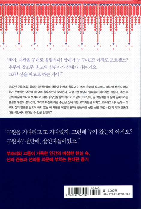 인간의 고통에 대한 책임을 물어 하나님을 재판대에 세우고 유죄로 판결하는 것을 불경한 상상력이라 타박만 할 수 있을까? 이 책에는 극한의 참상에 몸부림치는 인간의 절망적인 신음소리가 담겨 있다. 그것은 “엘리 엘리 라마 사박다니”(시 22:1)와 “하나님이여 주께서 어찌하여 우리를 영원히 버리시나이까”(시 74:1)라는 절규를 연상케 한다. 이 책이 ‘현대판 욥기’라는 말을 듣는 것은 놀랄 일이 아니다. ‘인류를 향한 메시지를 가진 사람’이라는 칭호와 함께 노벨 평화상을 받은 저자는, 아우슈비츠 수용소에서 가족을 잃고 살아남으며 겪었던 신앙적 고뇌를 17세기 연극에 투영해 누구도 쉽게 답해서는 안 될 난제를 제시한다. 거기엔 지금도 이해할 수 없는 참상을 겪고 있는 신앙인들의 처절한 몸부림이 배어 있다. 이 책은 세월호와 같은 비극을 겪은 생존자들의 진짜 아픔이 무엇일지 이해할 실마리를 던져준다.