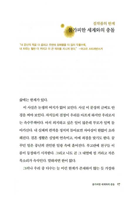이 책은 그러한 한계에 마주선 이들에게,인생의 이야기란 사람마다 독특하며, 우리를 좌절케 하는 바로 그 한계들이 오히려 우리에게 치유와 새로운 성장을 가져다 줄 수 있다.