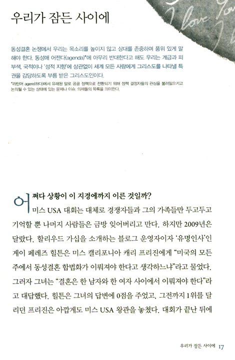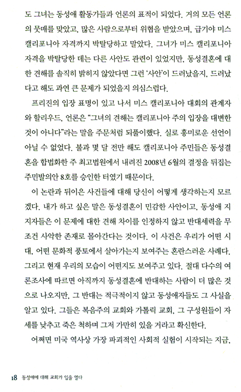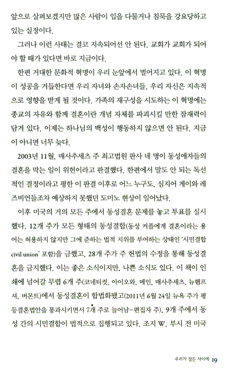 그리고 얼마 안 가서 나는 많은 신자가 이 문제에서 어떤 입장을 취해야 할지 모르고 있다는 사실을 알게 되었다. 어떤 사람들은 우리가 동성애자들의 결혼을 허용해야 한다고 생각했다. 그것은 그들의 일이고 우리와는 상관없다고 보기 때문이었다. 그들은 자신들의 세계에서, 우리는 우리 세계에서 살면 된다는 논리였다. 또 어떤 사람들은 이혼율이 높은 이성애자들이 비판적인 시선으로 바라볼 자격이 없다고 생각했다.