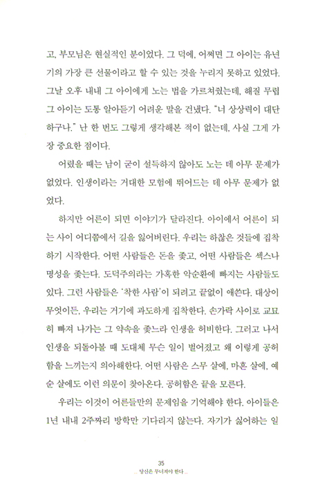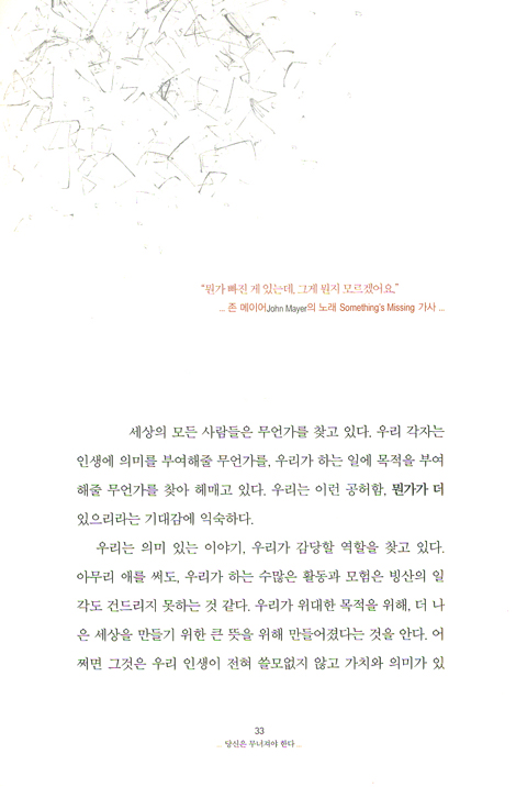 사람들은 지금까지 살아오던 삶의 방식, 지역, 직장, 가치관을 내려놓고 삶의 방향을 재조정하는 일을 두려워한다. 각박한 직장생활은 실수를 용납하지 않으며, 한 번 도태되면 자신이 가진 모든 것을 잃을 수도 있기 때문이다. 그래서 사람들은 점점 안전한 길, 검증된 길만 추구하며 새롭고 창의적인 생각보다는 틀에 박히고 구태의연한 현재에 만족하려고 한다. 자신만의 안전지대에 평안히 앉아 별일 없이 무의미한 하루하루를 보내다가 겨우 월급날이나 여름휴가에서 느끼는 짧은 기쁨으로 남은 날들을 살 뿐, 일상에서는 의미를 찾지 못한다. 그러면서도 자신의 인생에 의미를 부여해줄 어떤 일, 우리가 하는 일에 목적을 줄 무언가를 찾아 헤맨다. 우리는 이런 막연한 기대감에 익숙하다.