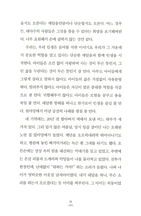 무너짐에서 가장 힘든 부분은 무너지고 난 이후다. 여행이 끝나고 기억이 희미해지고 다시 일상으로 돌아왔을 때. 삶의 속도가 느긋해지고 우선순위가 바뀌면 당신은 스스로 묻게 될 것이다. 내가 배신자가 된 것은 아닐까. 당신은 결혼하고 집을 사고 아이도 낳을 것이다. 자원봉사는 그만두고 아침 9시에서 오후 5시까지 일하면서 내가 무뎌진 것은 아닌지 염려할 것이다. 과거를 그리워하고 옛날 일기장을 뒤적이며 후회할 것이다. 이게 도대체 어찌 된 일인가 어리둥절할 것이다. (다른 사람의 인생 무너뜨리기)