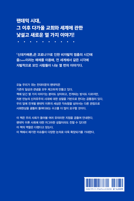 다분히 고색창연한 『신데카메론』이라는 제목은 『데카메론』이 그랬듯이 새로운 현실, 새롭게 찾아올 세계를 호명한다. 역병으로 재편되는 세계와 함께, 석연치 않았던 교회의 불행한 면면들도 새로운 빛 아래로 들어간다. 그래서 큰 고통에도 불구하고 코로나19 팬데믹은 한국 교회에 또 다른 기회일 수 있다. 교회와 세계의 재편을 예고하는 열 가지 이야기는 앞으로 어떤 길이 가능한지를 흥미롭게 들려준다. 이제 선택은 전에 없던 파고를 넘으며 위태롭게 하루하루를 넘기고 있는 교회에 달렸다. 세계와 함께 변화할 것인가, 아니면 어제와 함께 사라질 것인가.