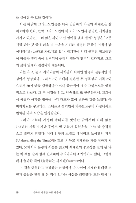 신앙의 성화 과정처럼 성경적 세계관 정립도 평생에 걸친 작업이다. 그리스도인은 더욱 민감하게 자신의 세계관을 살펴보아야 한다. 세상을 보는 렌즈에 나도 모르게 오염된 부분이 무엇인지 발견하고 바로 세우는 작업이 필요하다. 그런데 많은 그리스도인이 거듭남의 기쁨 속에 기존의 세계관은 그대로 둔 채 그 위에 그리스도의 복음을 급하게 세우곤 한다. 저자도 40대 중반에 진정으로 회심했지만 젊은 시절에 형성된 진화론적 세계관이 여전히 그의 학문 세계의 패러다임으로 영향을 끼치고 있음을 알게 되었다. 그러던 중 친구의 소개로 데이비드 노에벨의 《Understanding the Times》를 번역하게 되었고(2013년) 그 과정에서 세계관의 중요성과 이 세상에서 벌어지고 있는 치열한 영적 전쟁의 실체를 파악하게 되었다.