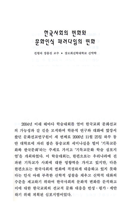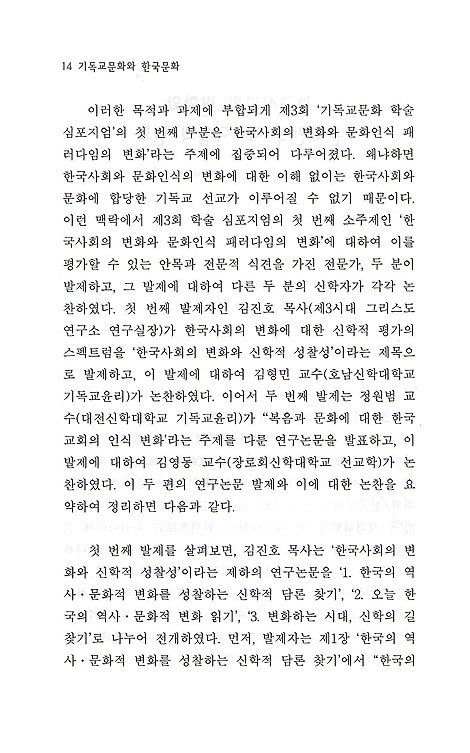 첫째 부문에서는 한국교회가 그 동안 우리 사회문화적 변동에 대해 어떻게 반응해왔고, 그러한 대응의 역사를 통해 문화신학의 전통적인 주제인 '그리스도와 문화'라는 측면에서 폭넓게 펼쳐진 신학적 스펙트럼을 살펴보았다.