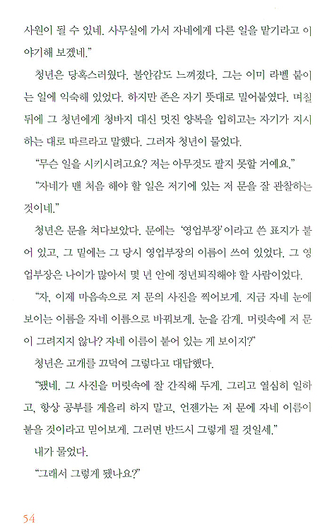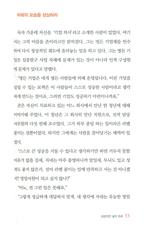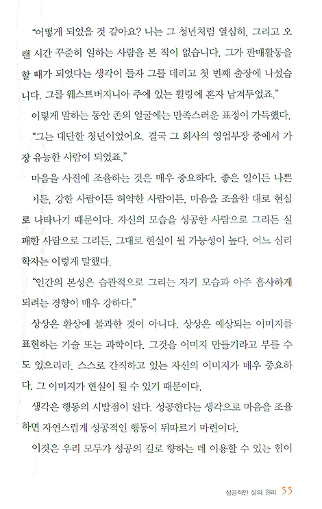 거듭되는 실패를 참고 견딜 필요가 없다. 이것은 실제이지, 이론이 아니다. 내가 확신하는 이유는 많은 사람들이 실패를 성공으로 변화시킬 수 있는 힘을 보여주었기 때문이다. 그러한 변화가 쉽게 오지는 않는다. 그러나 변화는 일어날 수 있고, 실제로 일어나기도 한다. 그것이 중요한 것이다. 더 이상 당신에게는 실패가 없다고 스스로 결정하고 여기서 설명한 원칙을 그대로 실천한다면, 분명히 당신에게는 더 이상 실패란 말이 필요하지 않을 것이다.(71쪽)