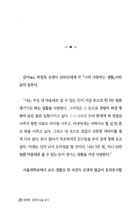 리먼브라더스 투자은행의 파산으로 촉발된 세계 금융시장의 불안정을 보면 현대 금융자본주의가 비극적 종말로 가는 것이 아닐까 하는 의구심이 든다. 지난 십수 년 동안 아시아 외환 위기, 롱텀캐피털 파산, 서브 프라임 사태와 같은 금융 위기가 이어지고 있다. 이 위기의 본질은 무엇인가? 여러 가지 전문가적인 진단과 해결책이 제시되지만, 문제의 본질에는 인간의 탐욕이나 신뢰와 같이 물리적인 힘이나 제도로 다스릴 수 없는 것이 자리 잡고 있다. 이런 본질은 접어둔 채 국제 공조로 공동 기금을 마련하고 금융 거래와 예금을 국가가 보증하고 또 은행을 국유화해도 또 다른 변종의 위기가 예고도 없이 바람처럼 다시 나타날 것이다. 이 문제는 근본적으로 경제학의 합리성으로 풀 수 있는 성질의 것이 아니다. 그러면 어떻게 해야 할까? 다시 20년 전 크리스토퍼 해리스 교수의 세미나에서 문득 품었던 생각이 떠올랐다. 성경이 해답일 수 있다! p 9