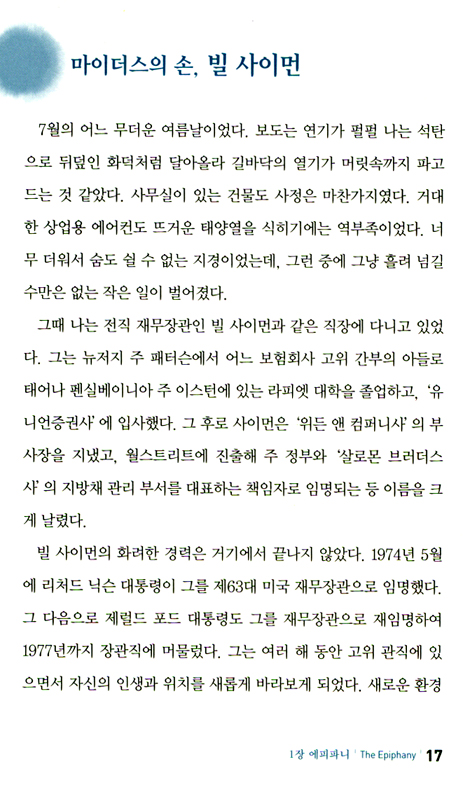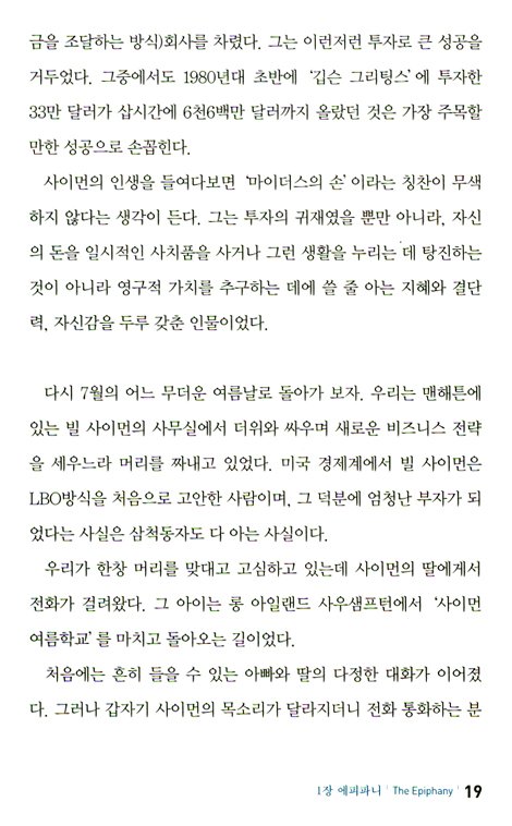 “버스정류장까지 거의 다 와서 나는 정신적으로 벼락을 맞은 듯한 큰 충격을 받았다. 갑자기 구름이 갈라지는 것 같았다. 겨울은 온데간데없고 밝은 햇살이 나를 따스하게 감싸 안는 것 같았다. 바로 그때 나는 스스로 이렇게 중얼거리고 있었던 것이다. ‘앞으로 나는 절대 평범하게 살지 않을 거야! 어떤 시련이 닥쳐도, 또 어떤 무시무시한 역경에 부딪혀도 절대로 지지 않을 거야. 난 꼭 성공하고 말거야!’이것은 나 자신과의 약속이며, 내가 내 자신에게 거는 최면이었다. 나는 세상 통념을 극복하기로 굳게 다짐했다. 하루아침에 바뀌지 않을 것이라는 점은 알고 있었다. 하지만 모든 것을 새로운 시각에서 바라보기로 다짐하고 나니, 실제로 겨울비가 오는 세상도 암울해 보이지가 않았다. 나는 남들이 아무리 동경하고 찬사를 보내는 길이라 해도 내가 먼저 확신이 서지 않으면 그런 길에 발을 들여놓지 않기로 마음먹었다. 그것은 나의 메타모포시스요, 가난과 절망으로부터의 엑소더스였다. 나는 그 때의 결심이 있었기에, 그리고 그것을 흔들림 없이 실천하며 살아왔기에 지금의 내가 있다고 생각한다. 나는 내 아이들에게도 그렇게 살라고 가르친다.