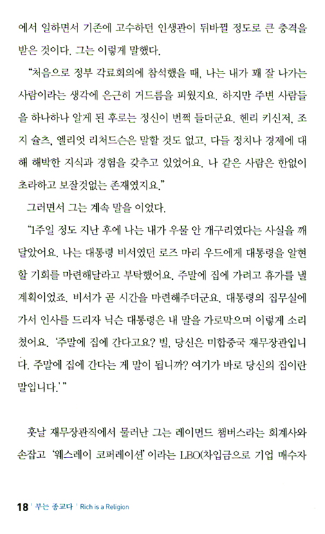 또 저자는 자신은 ‘부의 종교’의 전도자임을 자임하면서, 우리에게 ‘부의 종교’에 귀의하여 신이 우리에게 준 소중한 선물인 인생을 행복하게 누릴 것을 역설한다. 그는 책 속에서 자신의 경험을 바탕으로 이렇게 말한다.