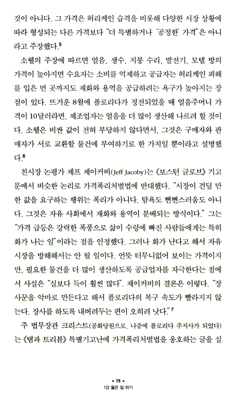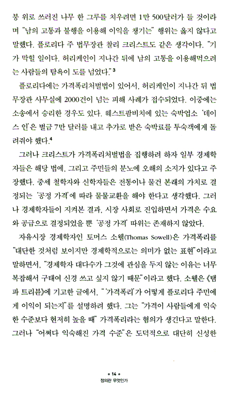 1) 태풍 허리케인이 지나간 뒤, 생활재의 가격폭리처벌법에 대한 찬반 논쟁(13~21쪽 참조)은 재화와 용역을 판매하는 사람이 자연재해를 이용해, 시장이 견디기만 한다면 어떤 가격을 불러도 상관없는가? 가격폭리 금지가 구매자와 판매자의 자유로운 거래를 방해할지라도 정부는 가격폭리를 금지해야 할까? 와 같이 무엇이 과연 옳은 일인가의 문제, 곧 정의에 관한 복잡하고 어려운 질문을 던진다. 이러한 질문은 단지 개인이 서로를 어떻게 대해야 하는가를 묻는 것으로 끝나지 않고, 법은 어떤 역할을 해야 하며, 사회는 어떻게 조직되어야 하는지를 묻는 것이며, 이에 대답하려면 정의의 의미가 무엇인지를 따져봐야 한다. 2) 이라크 전에 참전한 군인 중 상이군인훈장 수여 대상(22~25쪽 참조)의 자격에 대한 국방부의 선택은 옳았는가에 관한 논란은 아리스토텔레스의 정의론에 담긴 도덕 논리를 그대로 보여 준다. 3) 2008~2009년 구제금융을 둘러싼 논쟁(25~32쪽 참조)은 무모한 투자로 회사를 파산으로 몰고 간 사람들에게 수백만 달러의 상여금을 지급한 것에 대한 사람들의 분노의 중심에 정의와 도덕적 자격이 어떤 연관이 있는지를 잘 보여준다. 경제적 파국은 막아야 한다는 생각과 잘못을 저지른 은행과 투자사에 대규모 자금을 지원하는 것은 대단히 불공정한 일이라는 생각의 갈등 속에서 과연 구제 금융을 바라보는 시각이 정당한가라는 질문을 던져볼 수 있다.
