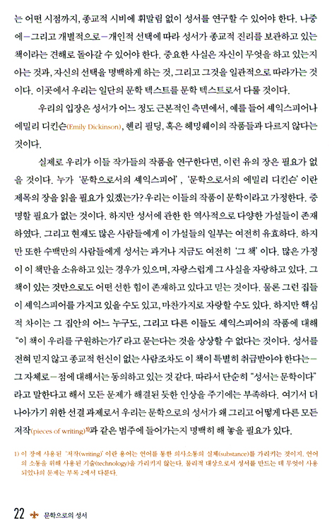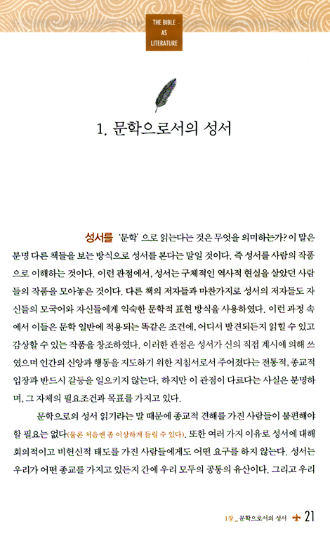 「문학으로의 성서」는 폭넓은 접근방식과 독특한 관점이 특징이다. 나는 성서를 문학으로 다룬 최근의 작품 가운데 이 책만큼 포괄적인 저서를 보지 못했다. 본서는 내용을 간략하게 서술하지만 주제를 철저히 다루고 있는 뛰어난 입문서이다.