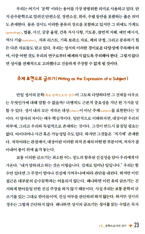 본서는 문학적 관점에서 성서를 전문적으로 연구하기 위한 핵심적이며 본질적인 개념들을 소개하고 있다. 내가 가르치는 학생들은 이 책을 통해 문학으로서의 성서 연구라는 분야에 큰 관심을 보였으며, 이 연구가 자신들의 삶과 신념에 본질적 영향을 미쳤다고 표명하였다. 이 책을 통해 나 역시 이 분야에 있어 더 훌륭하고 자격을 갖춘 학자가 될 수 있었다.