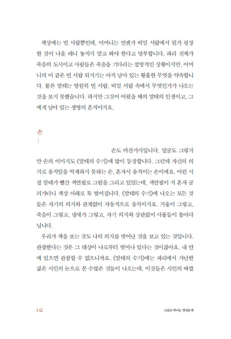 “《말테의 수기》는 같은 테마가 되풀이되면서 점점 깊어집니다. 그러니까 정말 바쁜 분들은 끝까지 읽으려고 애쓸 필요 없습니다. 어디 릴케가 독자들이 이걸 다 읽으라고 썼겠어요? 작가들이 쓰다 보면 원고료 때문에 더 길게 쓰기도 합니다. (웃음) 릴케는 시인인데, 이 정도의 시를 썼다고 해보세요. 그 시를 어떻게 다 읽겠어요? 《말테의 수기》는 말이 산문이지, 아무런 스토리도 없는 시입니다. 그런데 작정하고 처음부터 차례대로 읽지 않더라도, 어느 정도 훈련된 독자들은 좋은 대목에 끌려서 끌려서 읽다 보면 마지막 탕자 이야기까지 다 읽게 될 거예요.” _110쪽