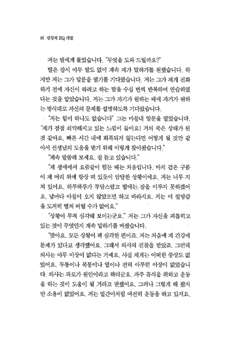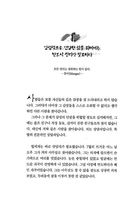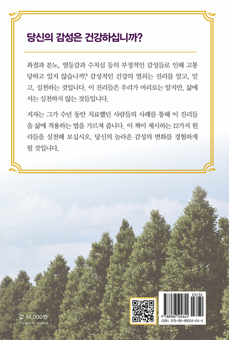 좌절과 분노, 열등감과 수치심 등의 부정적인 감성들로 인해 고통 당하고 있지 않습니까? 감성적인 건강의 열쇠는 진리를 알고, 믿고, 실천하는 것입니다. 이 진리들은 우리가 머리로는 알지만, 삶에서는 실천하지 않는 것들입니다. 저자는 그가 수년 동안 치료했던 사람들의 사례를 통해 이 진리들을 삶에 적용하는 법을 가르쳐 줍니다. 이 책이 제시하는 12가지 원리들을 실천해 보십시오. 당신의 놀라운 감성의 변화를 경험하게 될 것입니다.
