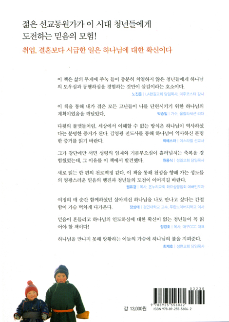 끝으로 그는 그리스도인의 사명에 대해 이야기한다. 우루무치에서 만난 조선족 선생님과 탈북자 사모님의 헌신을 통해 깨달은 사명은 ‘죽으면 죽으리라.’ 하는 마음으로 평생 이루어가는 것이었다. 예루살렘 골고다 언덕을 오르며 그는 자신의 사명을 깨닫는다. 먼저 그의 나라와 의를 구하며 복음 증거자의 삶을 사는 것. 돈, 직장, 건강, 생명보다 귀한 사명에 그는 자신의 전부를 하나님께 드리기로 결단하며 이 여행은 마무리가 된다. 여행 후 이십대의 절반을 선교지에서 보내고 현재는 서울의 한 교회에서 말씀 사역자로서, 청소년 사역자로서, 선교동원가로서 살아가고 있는 그는, 청년 시절 하나님을 경험하지 못했다면 지금의 삶을 결코 행복하다고 여길 수 없었을 것이라고 고백한다.
