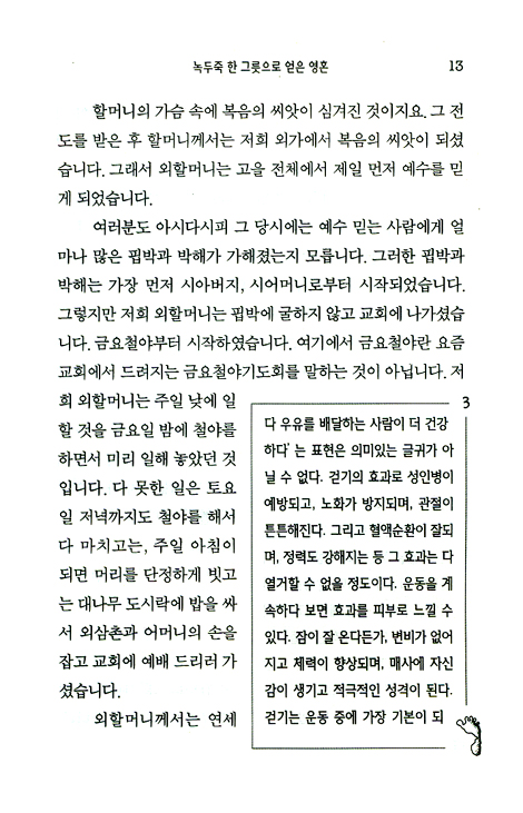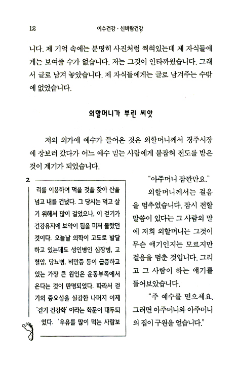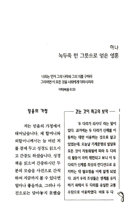 내가 이 책에서 전하고자 하는 것은 간단하다. 우리의 몸은 주의 성전이다. 때문에 주님이 성전 삼으신 우리는 건강한 삶으로 하나님께 영광을 돌리고, 봉사든 전도든 주의 뜻에 합당한 삶을 살자는 것이다. 또 내가 만난 하나님을 통해 우리 성도들의 믿음의 분량이 조금이라도 더하여지고, 남들보다 조금 더 아는 내용을 나눔으로 함께 좀더 건강한 삶을 누리자는 것이다.