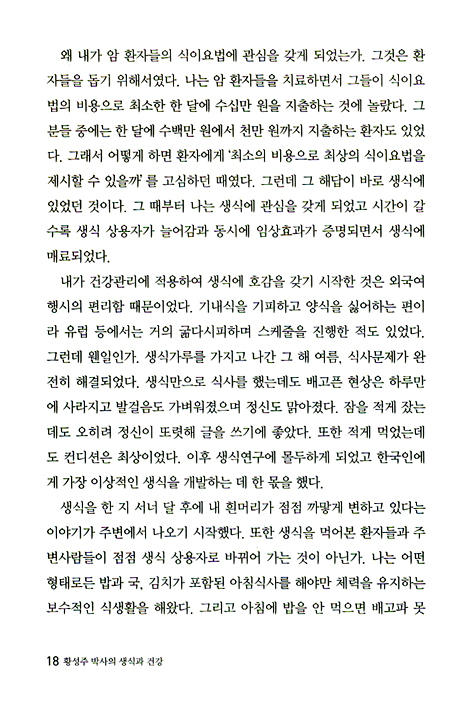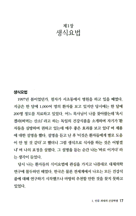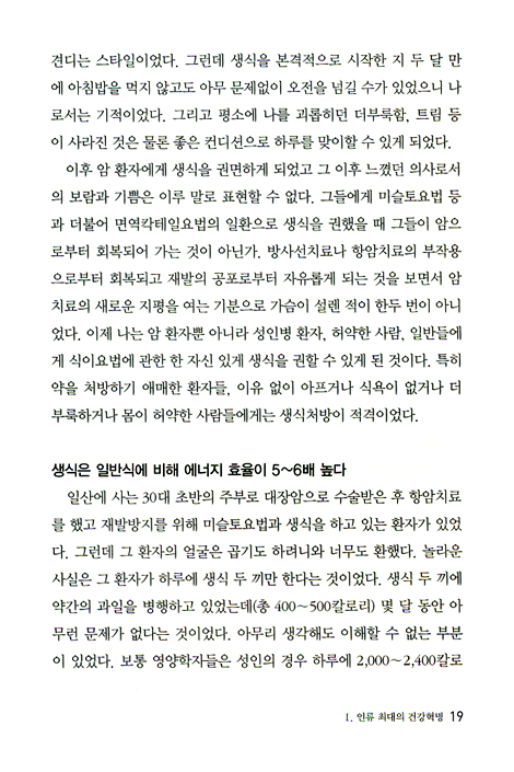 생식은 화식에 비해 면역력을 높이고 각종 질병의 예방, 개선, 치료효과까지 기대할 수 있는 가장 바람직한 식사이다. 건강의 법칙은 아주 단순하다. 자연 그대로 싱싱하게 살아있는 생식을 먹으면 몸도 살아나고, 불에 익혀 영양소와 생기가 사라진 화식을 먹으면 몸도 그렇게 된다. 이제 생명을 위해서 자연의 생명이 살아 있는 생식을 먹자. 음식으로 치료하지 못하는 질병은 약으로도 고칠 수 없다.