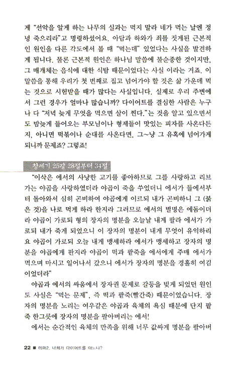 아담과 하와, 에서와 야곱, 이삭, 이스라엘백성, 모압왕 에글로, 삼손, 홉니와 비느하스, 엘리 제사장 등 탐식자를 중심으로 왜 다이어트를 해야 하는지, 40일 금식 후 광야에서 시험을 받으신 예수님과 바울서신을 중심으로 성경에 근거하여 왜 다이어트가 필요한가를 소개한다.