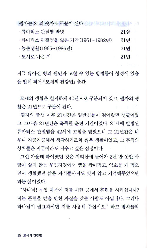 김해용 선생은 오랜 질병 생활 속에서 잃은 것보다는 오히려 신앙 가운데 얻은 것이 더 많았다고 했습니다. 그런 과정을 통해 얻은 건강지식을 성경 속에서도 찾게 되어 『모세의 건강법』을 썼다고 하니 건강을 염원하는 분들께는 분명히 도움이 될 것입니다.