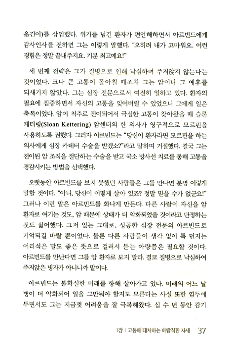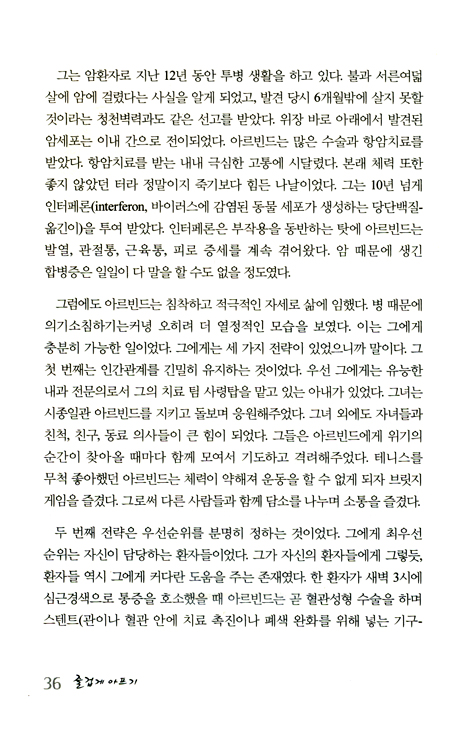 “만성질환을 앓고 있는 모든 분들이 한 번쯤 꼭 읽어보기를 권한다. 이는 아주 좋은 훈련 지침서가 될 것이다. 불치병 진단을 받은 여러분이나 사랑하는 사람들이 시간과 노력을 효과적으로 이용하며 최선의 선택을 할 수 있도록 도울 것이다.”