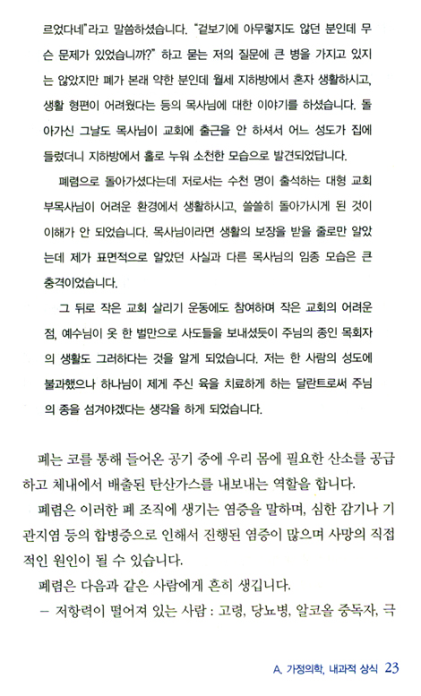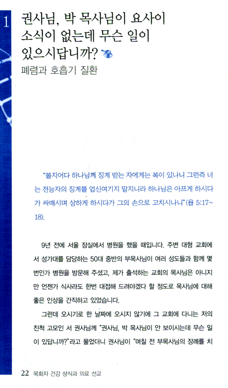 신앙생활을 하는 그리스도인들은 질병이 걸렸을 때 대부분 기도하고 믿음으로 고치려고 하고 병원을 다니면 믿음이 없는 것처럼 비쳐지는 선입견 때문에 공개적으로 치료하기를 꺼리는 경우가 종종 있다. 특히 목회자들은 병원을 찾는 것을 더더욱 꺼려 왔다.이 책은 그동안 선교회를 통해서 수없이 많은 목회자들과 성도들을 치료해 오면서 의학적인 기본 상식만 알아도 예방할 수 있었던 질병들에 대한 정보와 관리치료 방법, 건강 상식을 제공해 준다. 따라서 이 책을 읽고 스스로 건강을 체크함으로써 자신의 몸을 지킬 수 있다. 목회자들과 성도들이 병원에 대한 선입견을 버리고 건강을 회복하는 데 도움을 줄 것이다.