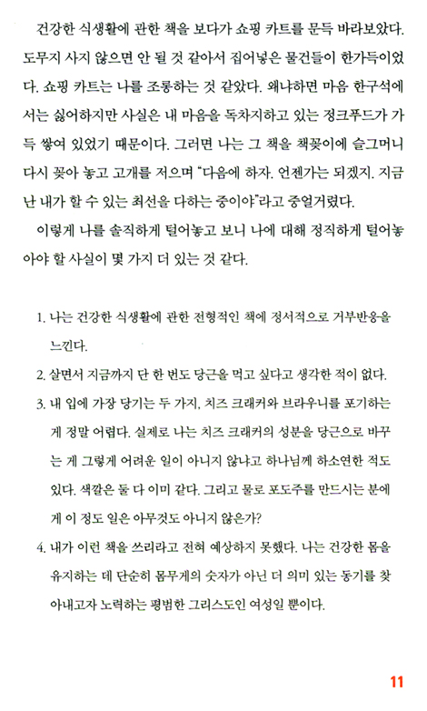 “이 책은 다이어트 책이라고 하기엔 좀 이상하지만 여하튼 최고의 다이어트 책이에요. 저자는 나쁜 식습관의 뿌리를 돌아보고 그 뿌리를 뽑아 버리도록 도와줘요. 살을 뺀 만큼 얻은 것이 있어요. 바로 자기 훈련이라는 것이에요. 더 건강하게 살아가고 싶어 하는 사람들에게 이 책을 진심으로 추천해요. 이제 예전과는 다른 제가 될