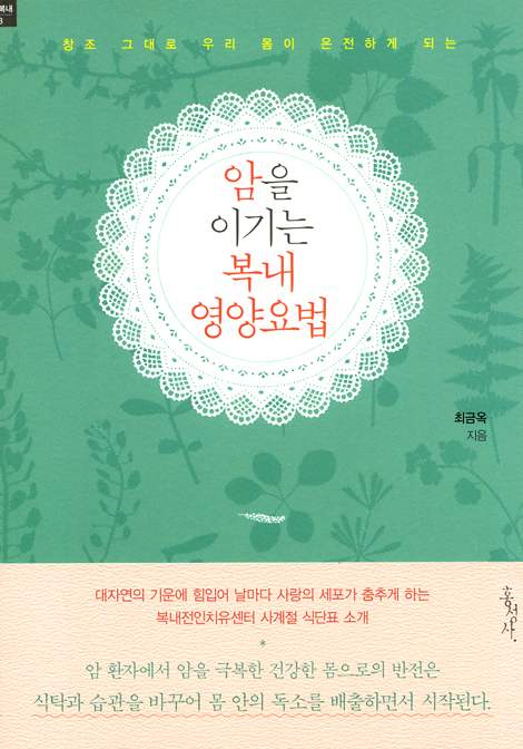 시중에 암 환자들을 위한 요리책은 많다. 항암에 좋은 자연식, 보양식, 식탁 가이드 등의 책들이 넘쳐난다. 그러나 암 치유의 바른 영양학 관점에서 실재적인 이론과 요리가 소개된 책은 좀처럼 찾아 볼 수 없다. 그뿐 아니라 재료를 쉽게 구할 수 없는 요리가 제시되어 실생활에 활용하기도 어렵다. 이런 가운데 암 환자와 가족들을 안심시키는 쉽고 간편한 요리법과 식단의 기초와 원리를 제시한 책이 출간됐다. 질병 예방 차원에서 건강한 사람들도 꼭 알아야 할 식습관과 레시피가 소개된 《암을 이기는 복내 영양 요법》으로, 지난 17년간 암 환자와 불ㆍ난치병으로 고통 받는 환우들의 식단을 관리해 온 복내전인치유센터 최금옥 부원장이 정리했다. 쉽게 요리할 수 있으면서 항암 식탁의 핵심 요점이 담긴 이 책은, 저자의 배우자이자 복내전인치유센터 원장 이박행 목사의 《암을 이기는 치유 캠프 복내 마을 이야기》와 짝을 이루고 있다.