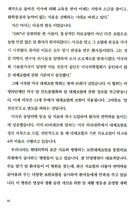 암 환자들의 영양 상태는 면역력과 직결되기 때문에 식이처방이 매우 중요합니다. 그래서 환자 개개인의 영양 상태, 가족력, 병적증상, 계절을 고려해 좋은 재료를 선택하여 적절하게 식단을 짜고 양을 조절해 주어야 합니다. 저희 센터에서 이런 기준으로 환자들을 상담하고 지도한 후 삶의 질이 높아지고 생명이 연장된 분들이 다수 계셨습니다. 그러나 대부분의 암 환자나 일반인이 무엇을 어떻게 먹어야 할지 몰라 허둥대는 것을 볼 때 마음이 아픕니다. 실제로 본원에 오시는 분들 가운데 대체의학에 의지하여 채식만 하다가 심각한 영양실조 상태로 입소하여 회복하지 못한 경우도 있었습니다. 반면, 병원치료에만 의존하다 몇몇 의사나 영양사 지도에 따라 육류와 가공식품을 무분별하게 섭취하여 혈액이 탁해져 암의 전이와 재발로 어려움을 겪는 환자도 자주 보았습니다. (중략)