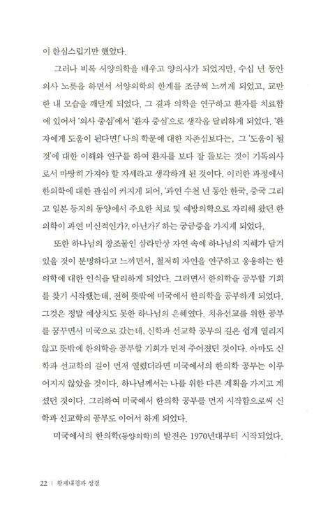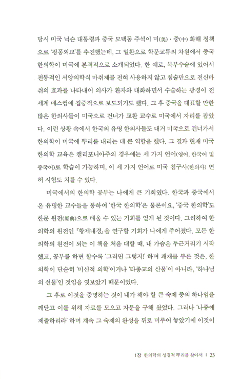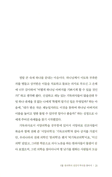 그러므로 이 저서가 한의학을 공부하면서 신앙적 정체성이 혼돈되거나 확신이 없는 분들에게 좋은 안내서가 되리라 생각합니다. 아울러 이 저서가 기독교적 관점에서 한의학의 가치를 연구하는 데 기폭제가 되어 더 많은 연구가 진행되기를 바랍니다. 그리하여 왜곡되어 있는 한의학을 다시 회복시키는 역사가 일어나기를 기대합니다.