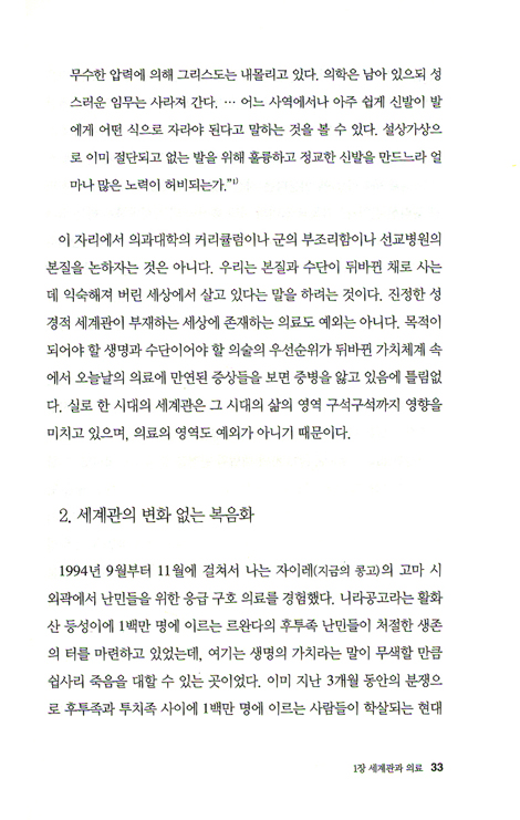 둘째, 이 책은 매우 현장적이다. 저자는 “놀랍게도”(?) 임상 현장에서 평생을 살아 온 내과 전문의이다. 그는 추상적이고 이론적으로 글을 쓰는 학자로서 이 책의 내용을 집필하지 않았다. 수많은 암환자들과 보호자들의 주치의로서 치열한 병원 현장 속에서 일하면서 품게 된 질문들에 정직하게 답해 보려고 진지한 성찰을 끊임없이 하였다. 그리고 아프리카에 의료선교사로 나가 한국보다 더 극한적인 어려움 속에 있는 수많은 환자들 곁에서 이론과 논리가 아닌 “인간에게 실제로 필요한 근본적인 의료관과 세계관”을 탐구하여 낸 결과가 바로 이 책이다. 그 현장성이 이 책에 더 큰 힘을 실어준다.