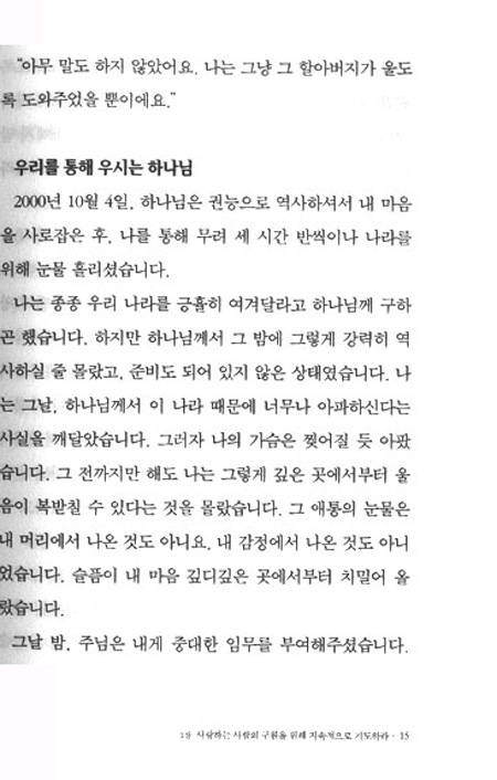 이 책은 당신이 사랑하는 사람의 구원을 위해 기도의 열정을 회복할 것을 촉구합니다. 남편이 벌어다주는 봉급 액수에만 관심이 있고, 그의 구원을 위해서는 기도하지 않는 아내, 그는 영적 직무유기죄를 범하는 것입니다. 일류대학 입학만 채근할뿐, 그 자녀의 구원을 위해 기도하지 않는 부모는 하나님이 맡기신 주님의 자녀를 사탄의 자녀로 키우는 셈입니다. 영혼 구원은 당신의 제1우선순위가 되어야 합니다. 이는 예수님의 지상명령(the Great Commission)이기도 합니다. 이제부터 모든 일에 우선하여 사랑하는 사람의 구원을 위해 열정적으로 간구하십시오.