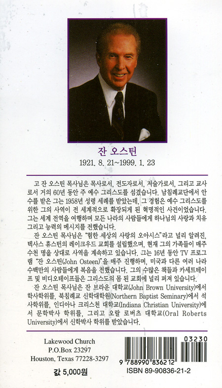 잔 오스틴 목사님은 "험한 세상의 사람의 오아시스"라고 널리 알려진, 텍사스 휴스턴의 레이크우드 교회를 설립했으며, 현재 그의 가족들이 매주 수천 명을 상대로 사역을 계속하고 있습니다. 그는 16년 동안 TV프로그램 "잔 오스틴"을 매주 진행하며, 미국과 다른 여러 나라 수백만의 사람들에게 복음을 전했습니다. 그의 수많은 책들과 카세트테이프및 비디오테이프들은 그리스도의 몸 된 교회에 널리 퍼져 있습니다.
