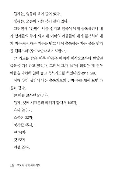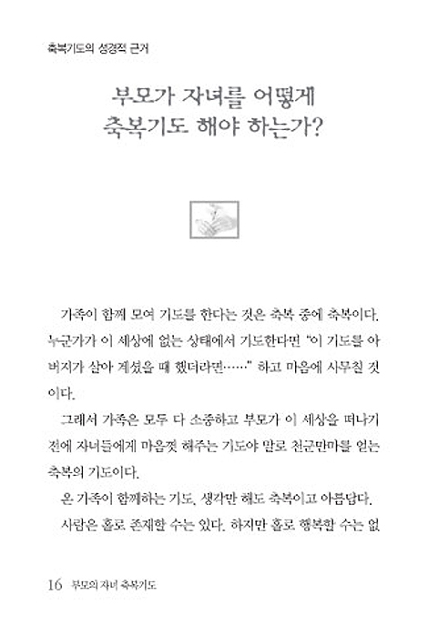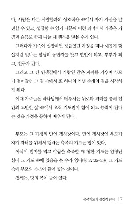 이 책은 어린 자녀들을 위해 어떻게 축복기도를 해주고, 그리고 그들이 결혼하여 가정을 이룬 후에 자기 가정을 위해 어떻게 기도해야 하며, 성년이 되어 늙어가시는 부모님을 위해 어떤 기도를 해드려야 하고, 교회생활을 하는데 꼭 필요한 기도들을 정리한 기도서이다.