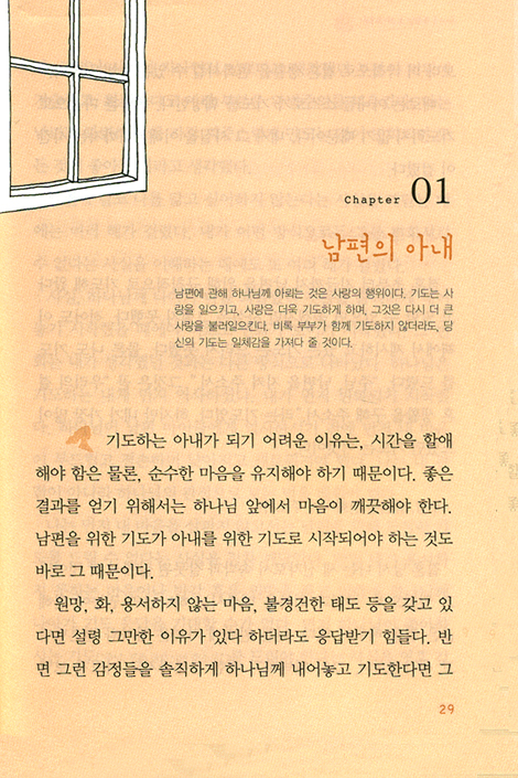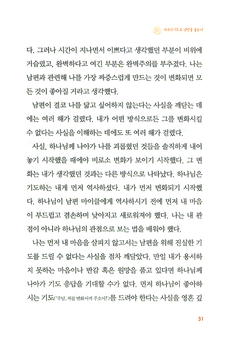 남편을 위한 30가지 기도 제목과 기도문을 담고 있는 이 책은 단순히 추상적인 기도만을 다루는 것이 아니라 남편의 일, 건강, 우선순위, 인간관계, 감정, 믿음 등 남편의 생활 전 영역을 다루고 있어 구체적으로 기도할 수 있도록 돕는다.
