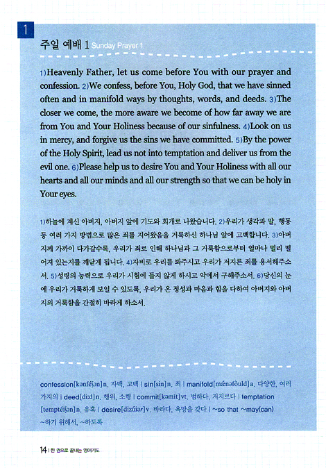 영어로 기도하는 습관을 들이다 보면 영어로 말하는 것이 더 자연스러워집니다. 항상 하나님과 동행하고 영어로 대화함으로써 우리가 그토록 원하는 프리토킹을 할 수 있게 되는 것입니다.