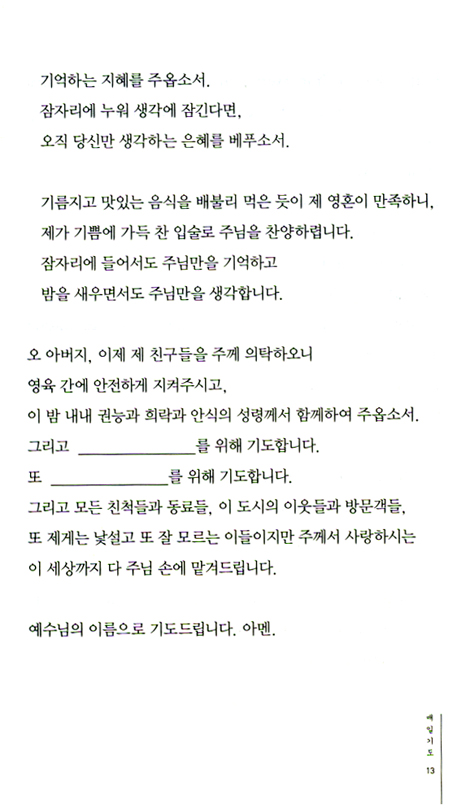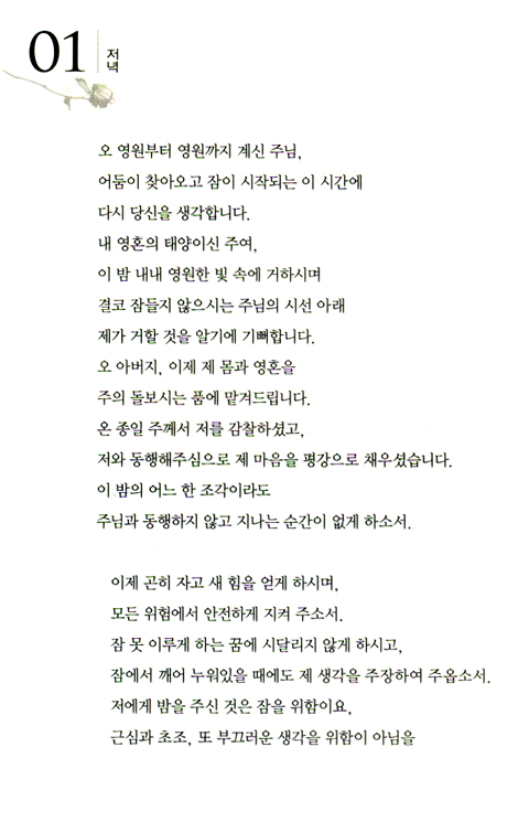 미국 유학 시절, 학교 서점에서 발견한 작은 기도서 한 권이 그 이후 나의 영적 여정에 그토록 큰 영향을 끼칠 줄 몰랐다. 기도가 제일 하고 싶었으나 기도가 제일 어려웠던 나에게 이 책은 참된 기도가 어떤 것인지를 가르쳐주었다. 여러번 읽고 기도했으나, 지금도 여전히 구절구절이 새롭다. 이 기도서를 가지고 진지하게 기도한다면, 독자들도 같은 경험을 하게 될 것이다.