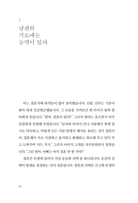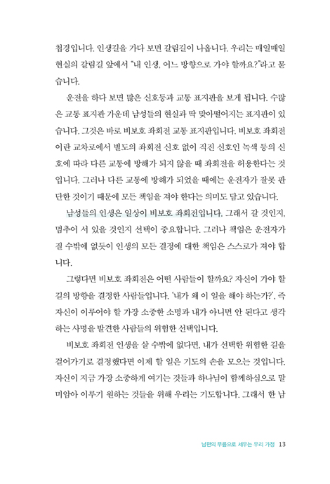 또한 오직 성경 말씀을 근거로 작성된 기도문이 삽입되어 있어, 어떻게 기도해야 할지 난감해 하는 남편들의 편의를 돕는다. 중언부언하지 않고, 예수님이 말씀으로 기도하셨던 것처럼 기도해 보자! 이 책은 깨어진 관계가 돈독하게 하고 흔들리는 가정을 견고하게 해줄 것이며, 남성의 시든 영혼을 하나님 앞에서 깨어나게 할 귀한 역할을 할 것이다.