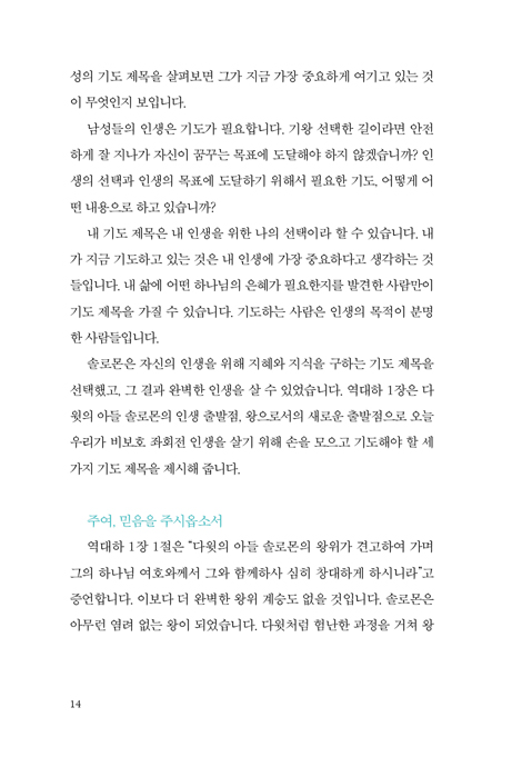 남성들의 인생은 기도가 필요합니다. 기왕 선택한 길이라면 안전하게 잘 지나가 자신이 꿈꾸는 목표에 도달해야 하지 않겠습니까? 인생의 선택과 인생의 목표에 도달하기 위해서 필요한 기도, 어떻게 어떤 내용으로 하고 있습니까?