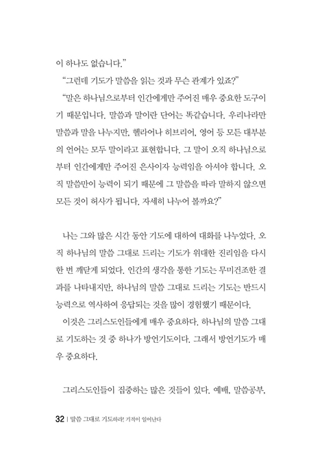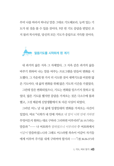 나는 30대 중반까지도 기도에 대해 문외한이었다. 기도를 어떻게 하는지 전혀 몰랐었다. 그런데 “내 새벽기도 네가 가져가라”라고 어머니가 유언을 남기시고 소천하신 후 달라졌다. 매일 새벽기도에 참석은 했지만, 나는 6개월 동안 입을 열어 기도할 수가 없었다. …… 시간이 흐르고 자연스럽게 기도하는 가운데 말씀 속에서 기도에 대한 질문에 조금씩 답을 알아갈 수 있었다. 그것은 문제를 기도하는 것이 아니라, 하나님 말씀 속에 있는 답을 가지고 기도해야 한다는 것이었다. (프롤로그 중에서)