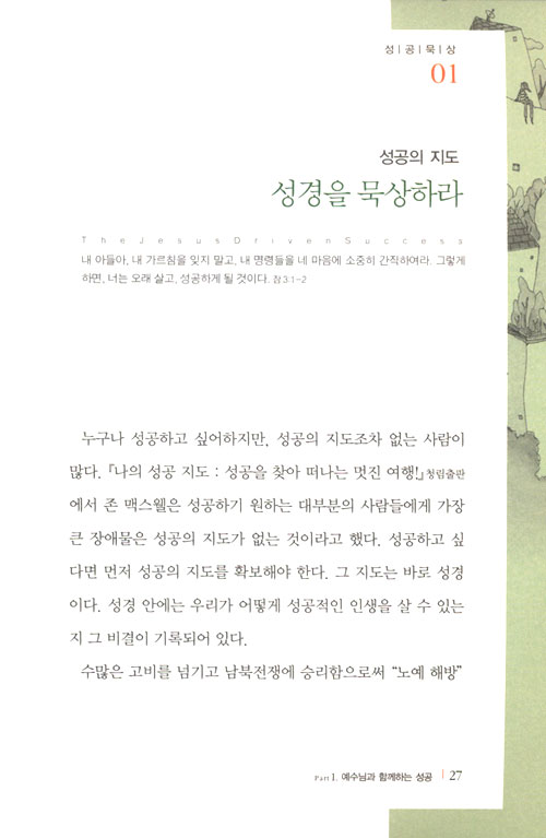 누구나 성공하고 싶어하지만, 성공의 지도조차 없는 사람이 많다. ……존 맥스웰은 성공하기 원하는 대부분의 사람들에게 가장 큰 장애물은 성공의 지도가 없는 것이라고 했다. 성공하고 싶다면 먼저 성공의 지도를 확보해야 한다. 그 지도는 바로 성경이다. 성경 안에는 우리가 어떻게 성공적인 인생을 살 수 있는지 그 비결이 기록되어 있다. _ p. 27 (성공묵상01 성공의 지도, “성경을 묵상하라” 중에서)