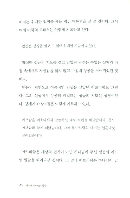 하나는 크리스천은 성공에 관심을 가져서는 안 된다는 것이고, 또 다른 하나는 세상에서의 출세가 성공이라고 생각하는 것이다. 모두 건전한 생각이 아니다. 성경 속 인물들은 물론, 이 세상의 중심에 서 있는 크리스천 성공자들이 많다. 그들의 여정을 들여다보면, 성공하기 위해서는 성공의 열쇠를 쥐고 계시는 하나님 말씀을 묵상하며 그 말씀대로 행하는 것, 다시 말해 예수가 이끄시는 성공이 필요하다는 결론에 도달하게 된다.