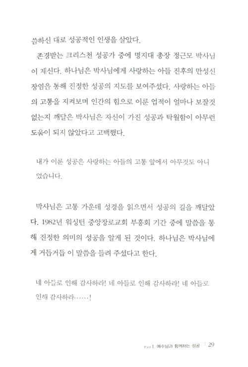 “위대한 성공을 경험한 사람들은 ‘나를 성공시키신 분은 예수님이십니다.’라는 고백을 많이 한다. 어떤 방법으로 예수님이 그들의 성공을 이끌어주셨을까? 이 책에 그 비밀이 있다.”