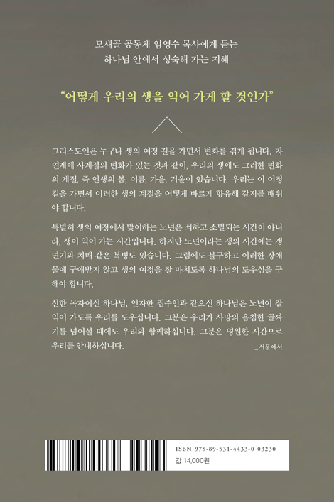 우리나라는 100세 시대라는 말이 통용화되고, 교회 안에도 백발의 지혜가 성성한 믿음의 세대들이 늘어가는 것이 현실이다. 이제 사회적 문제를 넘어 그리스도인들은 어떻게 나이 들고 성숙해지는 삶을 살 것인지 진지하게 고민해야 한다. 모새골 공동체 임영수 목사는 그리스도인은 누구나 생의 계절을 누리게 된다고 한다. 모든 것이 새로워지는 골짜기라는 뜻의 ‘모새골’이라는 이름처럼, 저자는 그리스도인의 삶은 “날마다 새롭게” 하나님과 동행하는 것의 연속임을 강조해 왔다.