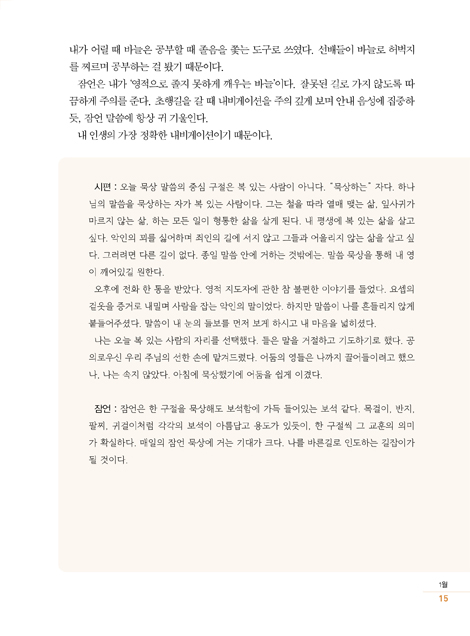 “시편과 잠언을 다 묵상하면 신구약 전체를 이해하게 되고, 그중에서도 성경 전체를 이해하는 데 중요한 핵심 구절을 뽑아서 다양한 각도에서 반복되는 말씀 묵상을 통해 성경 전권의 핵심 메시지를 이해하게 됩니다.” 정말 그랬다. 묵상하면서 신구약의 핵심 메시지를 파악할 수 있었고, 나의 시야가 넓어지는 걸 느꼈다. 5쪽