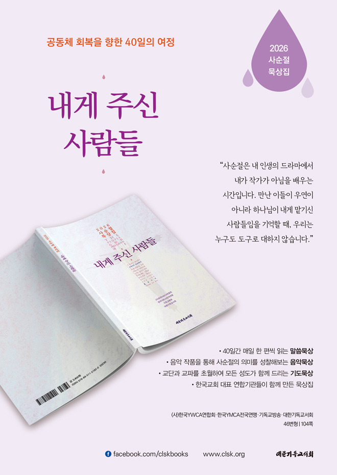 2026년 사순절 묵상집 『내게 주신 사람들』은 ‘핵(核)개인’이 일상이 된 시대 속에서, 하나님께서 우리 각자에게 허락하신 사람들과 공동체의 의미를 다시 성찰하도록 이끄는 묵상집이다.