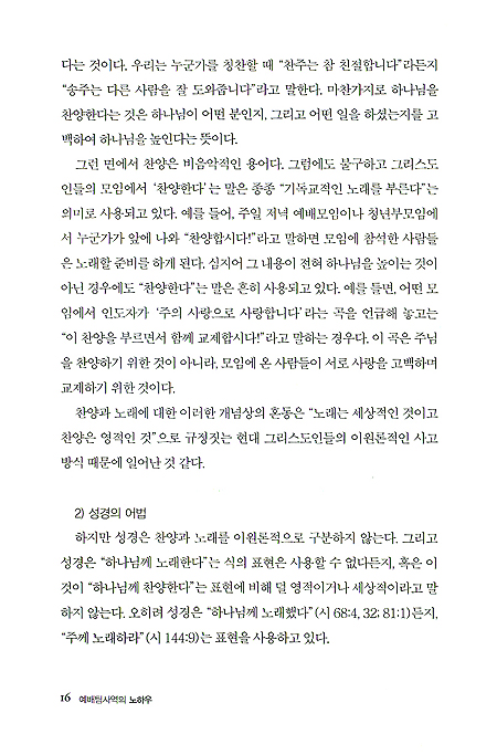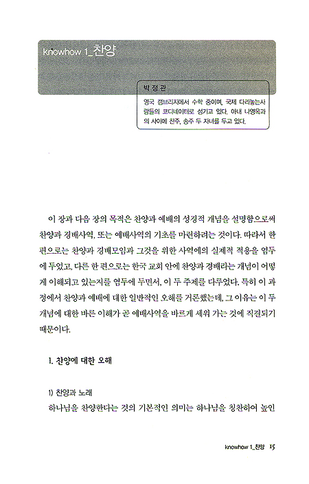 정립되어야 할 찬양과 에배 및 중보기도에 대한 성경적 이해,그리고 예배자의 영성에 관한 내용을 다루었고,